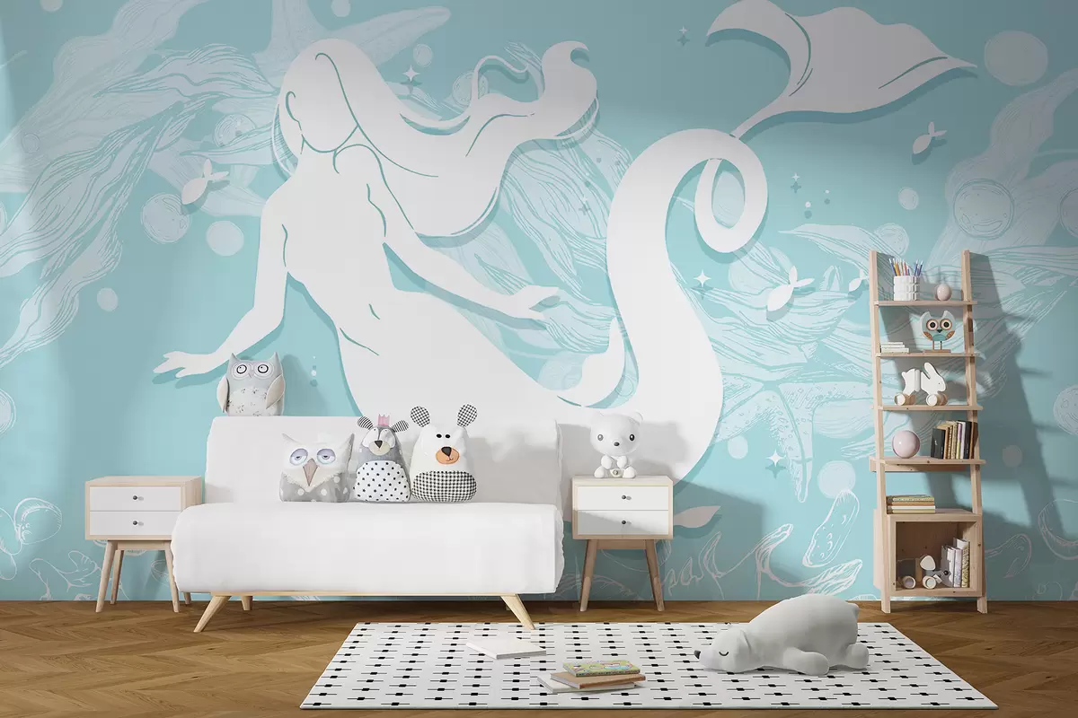 Fototapetes Balta nāra ar gariem plīvojošiem matiem peld gaiši zilā okeānā ar baltiem viļņiem un burbuļiem Nr. w01316