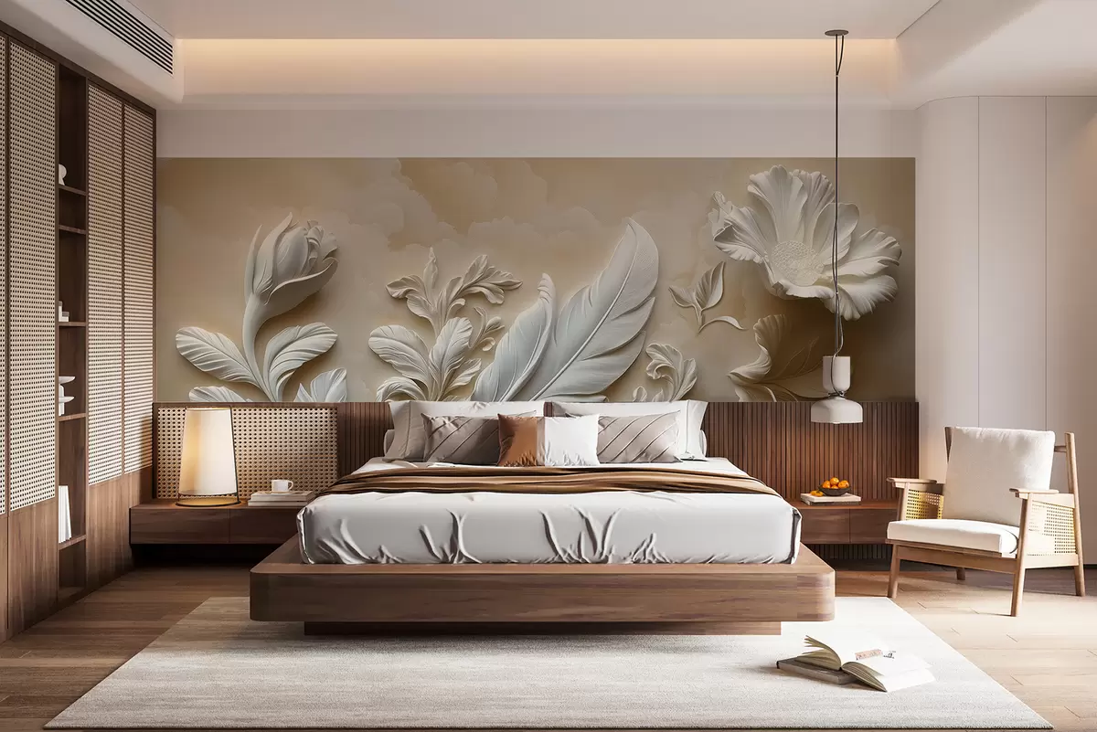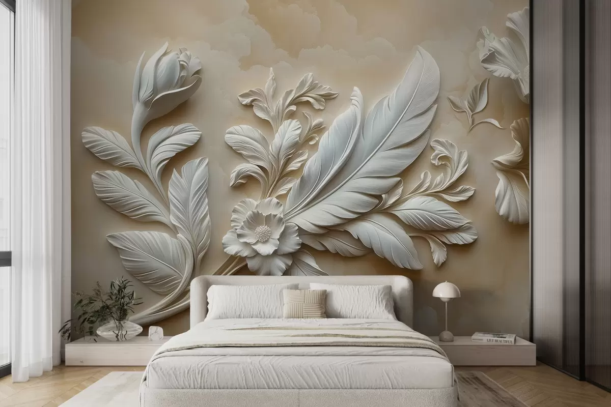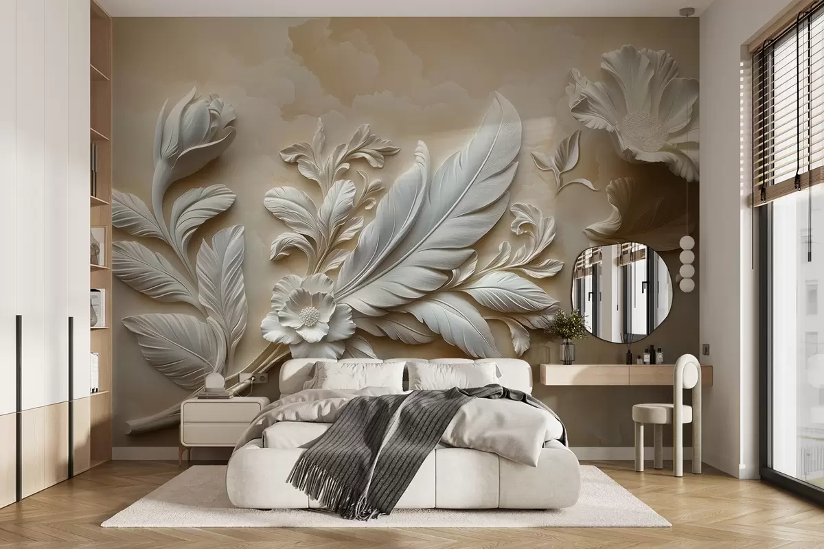 Fototapetes Graciozi reljefa ziedi ar lapām un spalvām bēšos toņos Nr. w01355