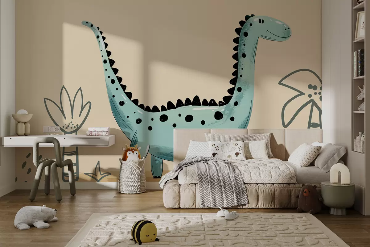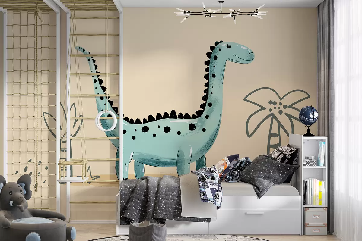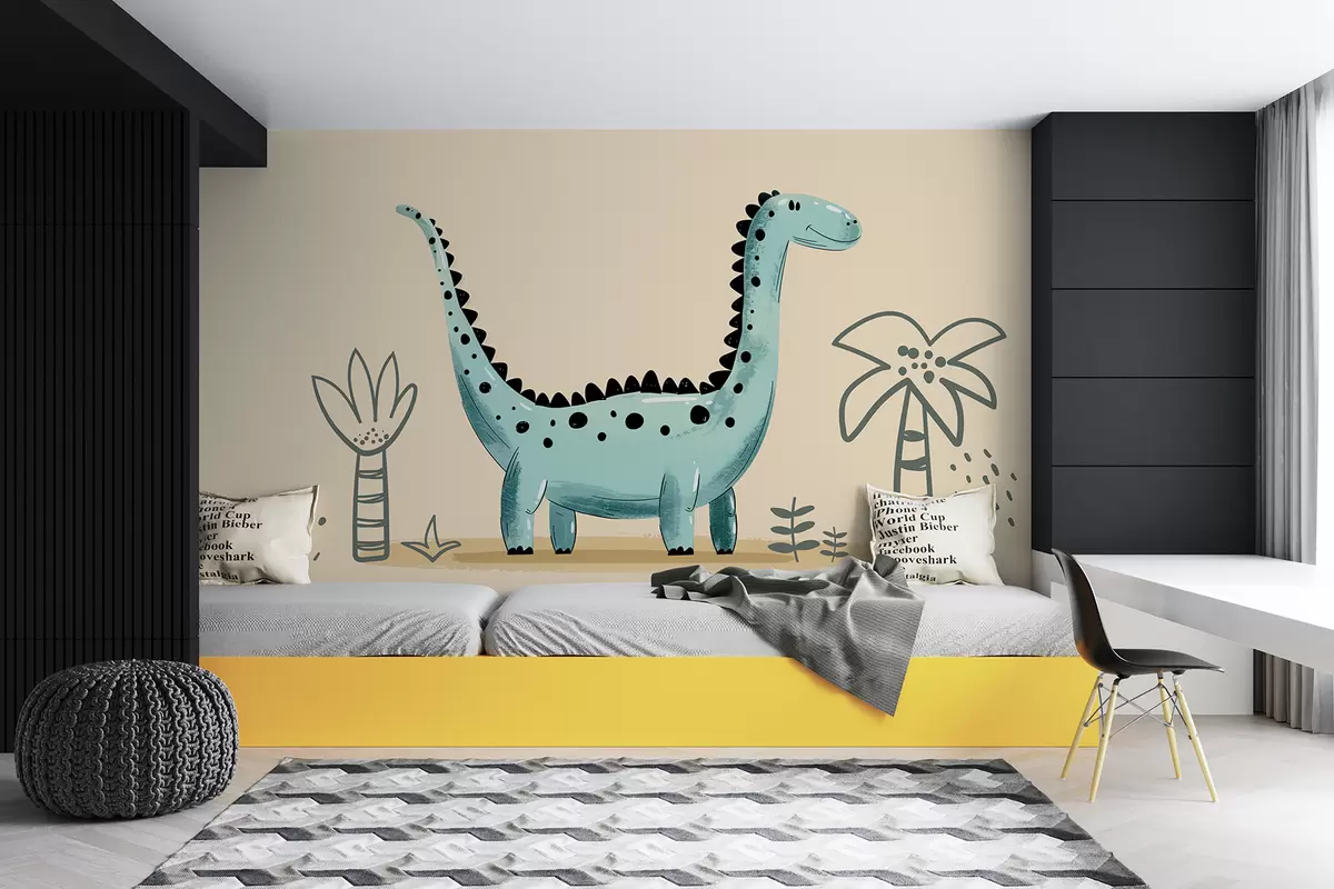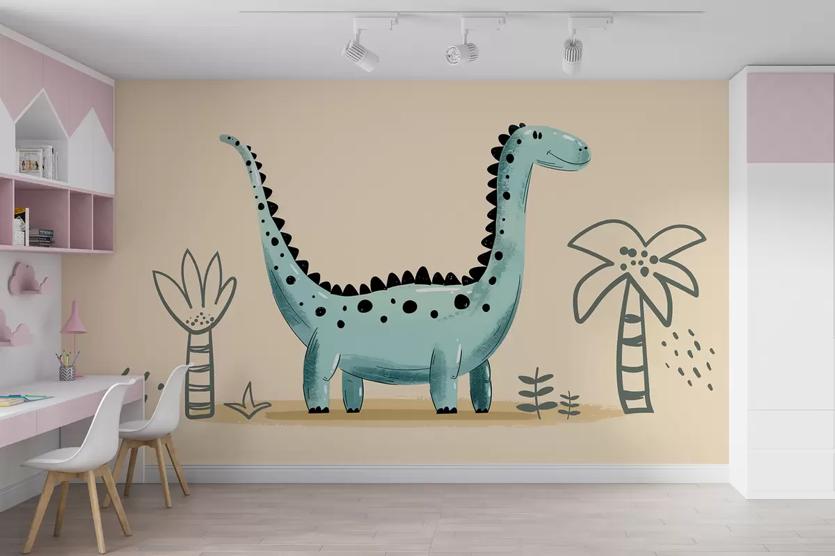 Fototapetes Jauks dinozaurs uz smilškrāsas fona ar palmām Nr. w01357v1