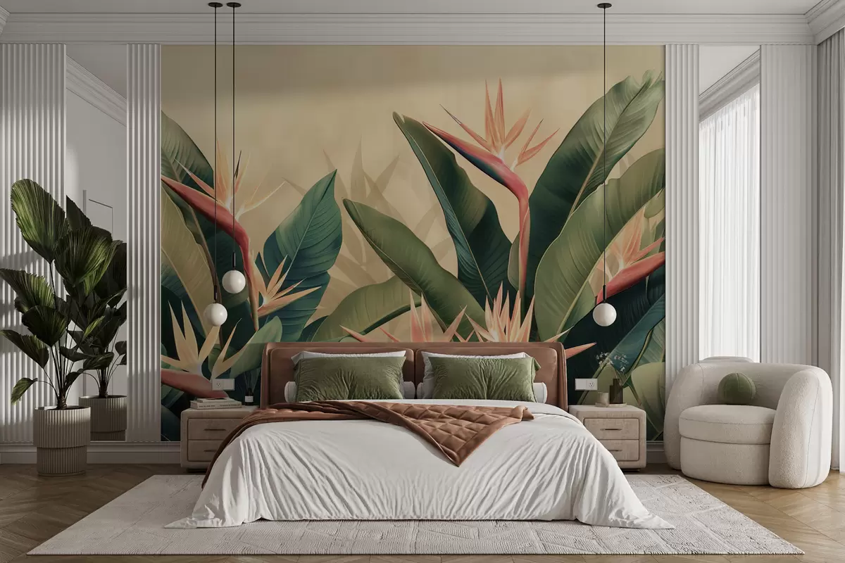 Fototapetes Sulīgs tropu ziedu izkārtojums, ko ieskauj lielas tumši zaļas lapas Nr. w01484v1