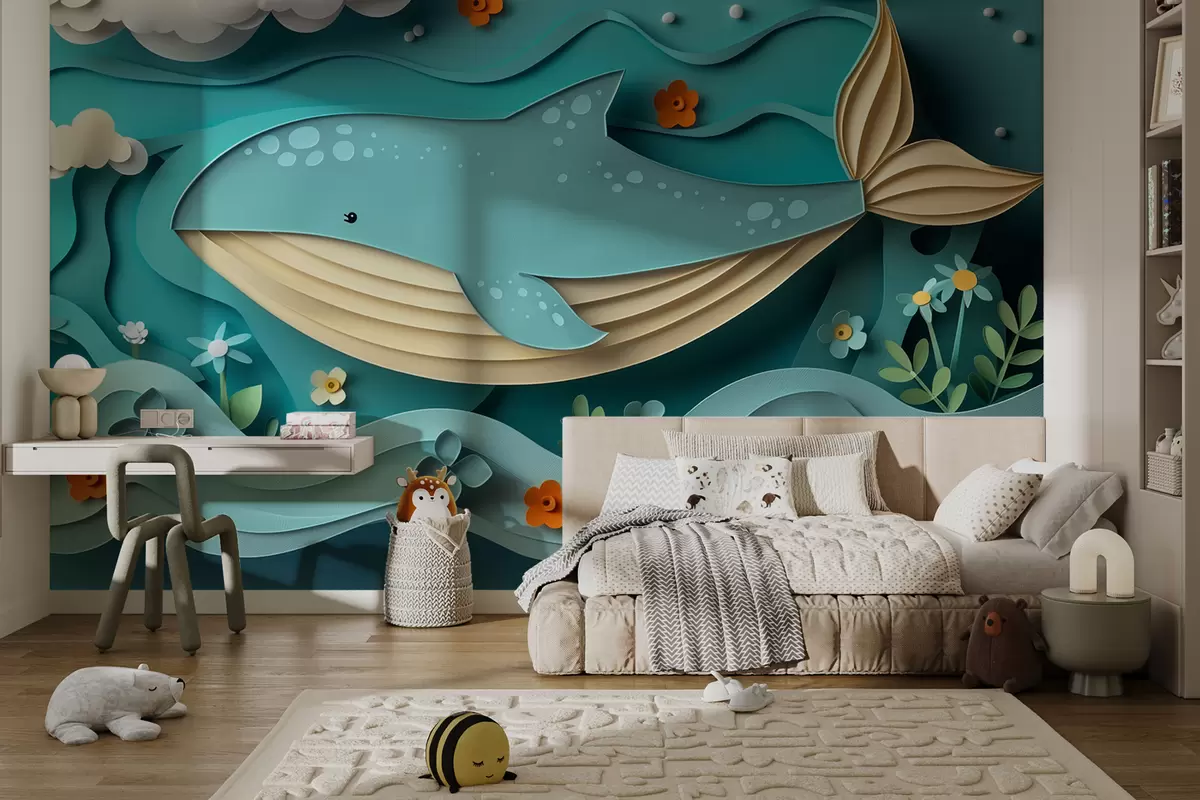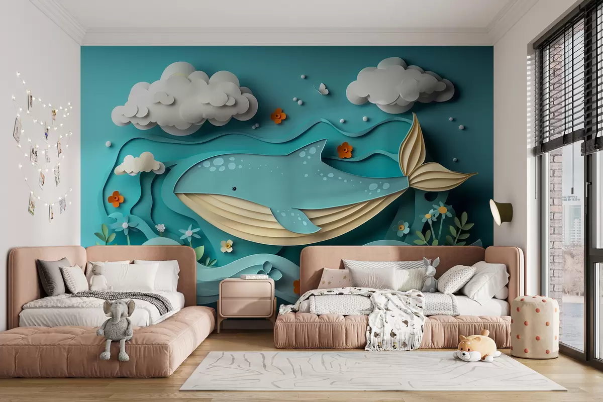 Fototapetes Rotaļīgs valis mākoņos papīra griezuma stilā, 3D efekts Nr. w01496