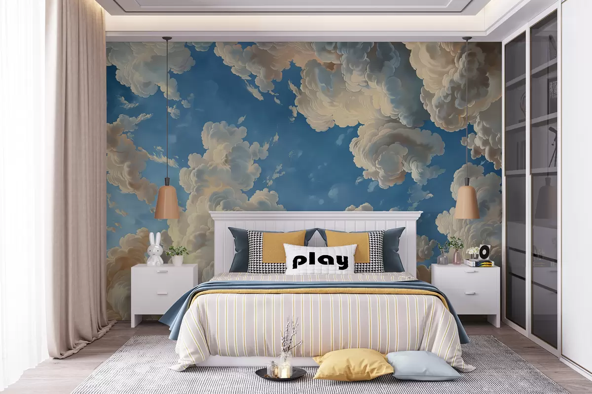 Fototapetes Krēmkrāsas, maigi persiku un gaiši toņos ieturēti mākoņi uz tumši zilām, koši zilām debesīm Nr. w01583