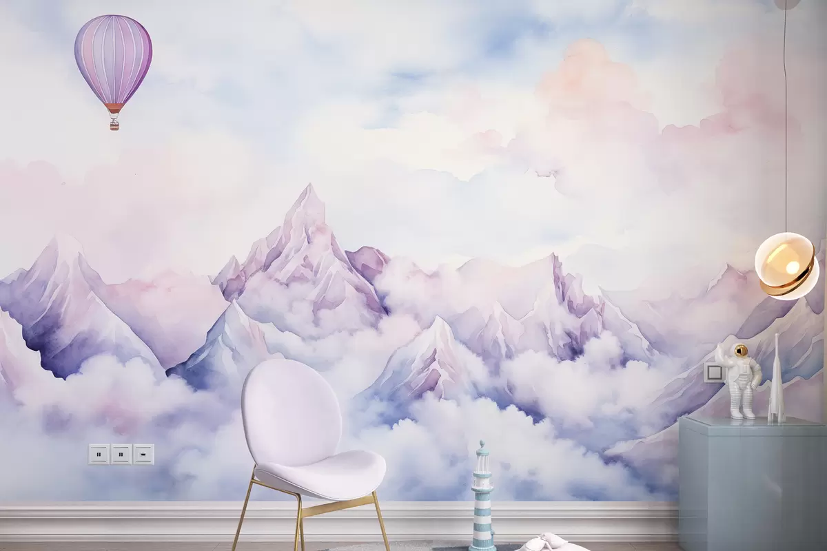 Fototapetes Gaisa balons kalnos, akvarelis, maigas ēteriskas krāsas Nr. w01789