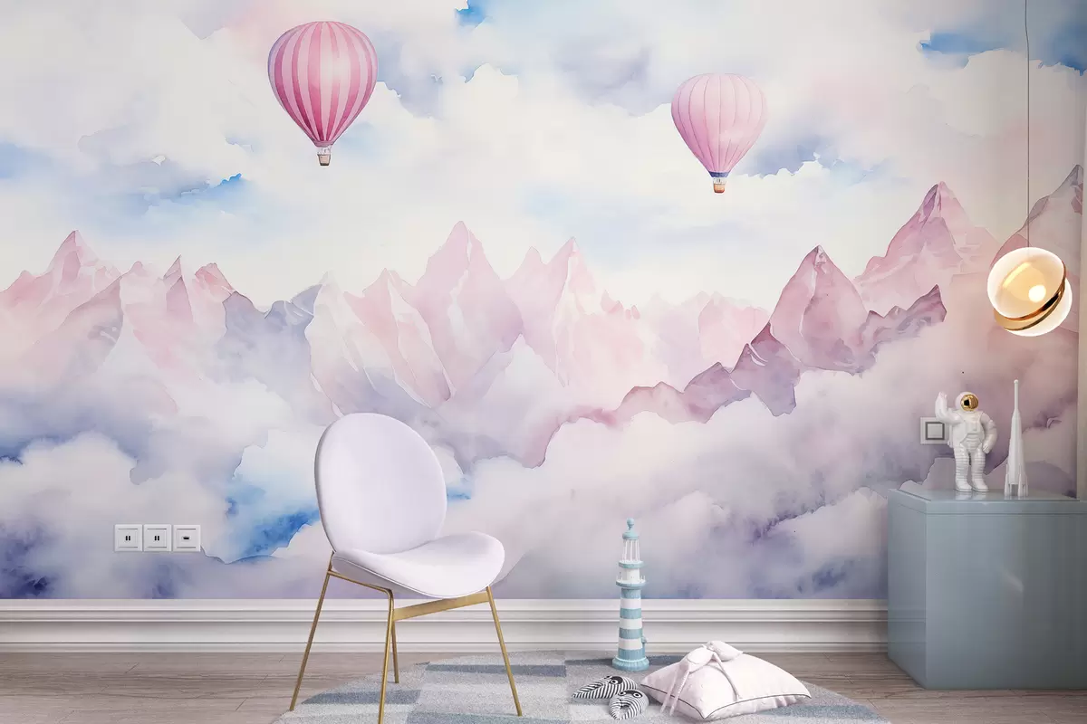 Fototapetes Skaista kalnu ainava ar gaisa baloniem, akvarelis Nr. w01792