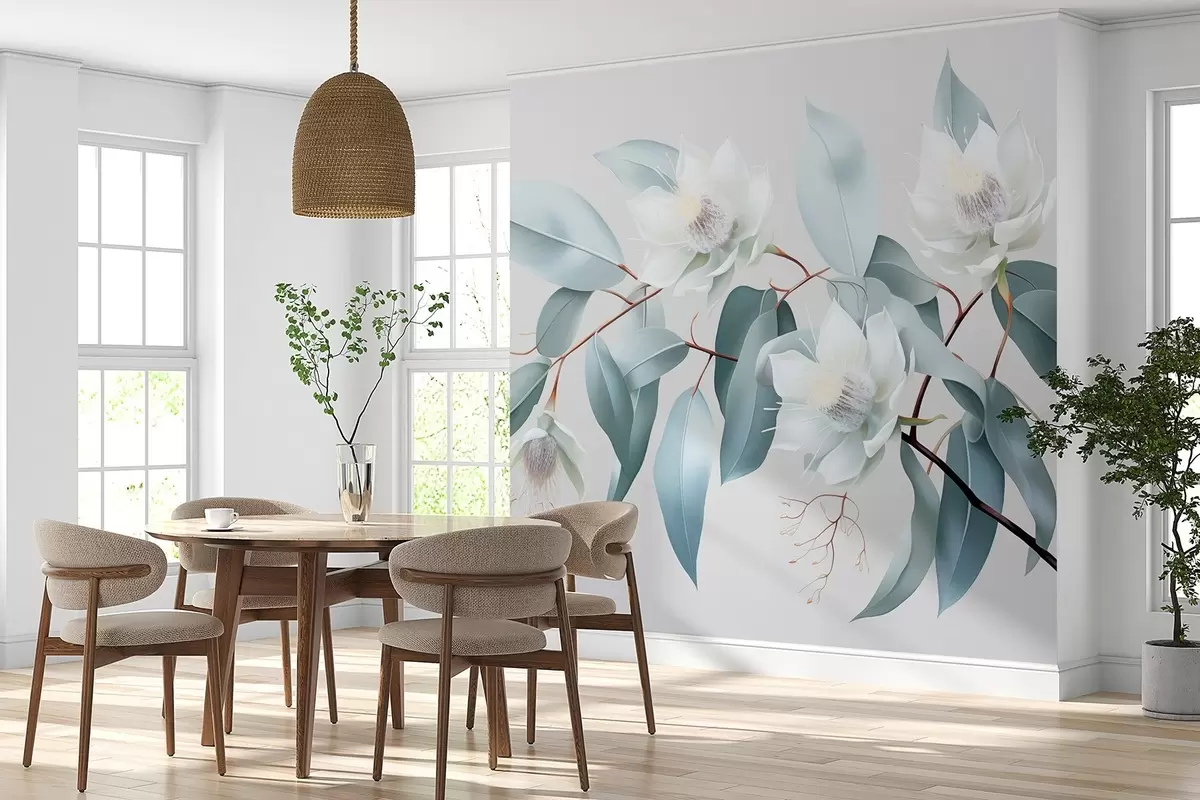 Fototapetes Jasmīna ziedi uz zara, akrils, maigi pelēkas krāsas Nr. w01885