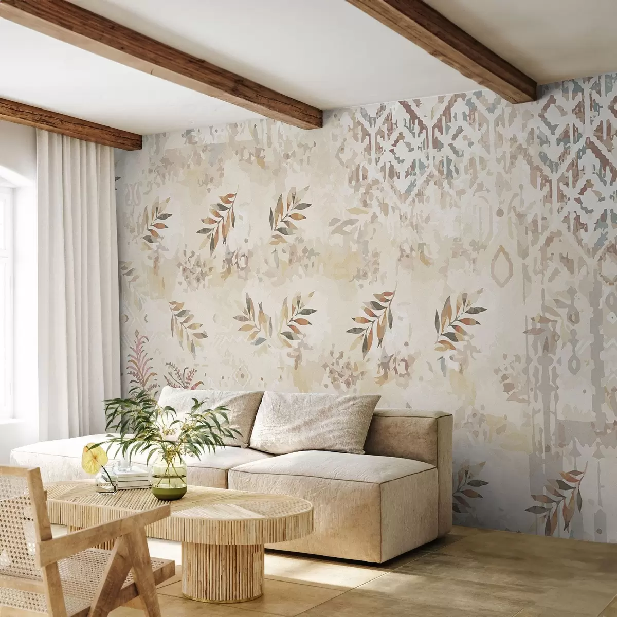 Fototapetes retro stila tapetes ar rakstiem, nodiluma, traipu un lapu elementiem bēšās krāsās Nr. w01955