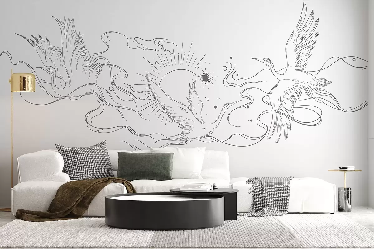 Fototapetes Lidojoši putni, līniju zīmējums, minimālisms, pelēkā krāsu palete Nr. w02022v2
