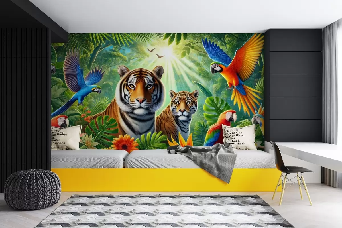 Fototapetes Krāsains sienas gleznojums ar tropu panorāmu ar tīģeru pāri, papagaiļiem un ziediem Nr. w02083