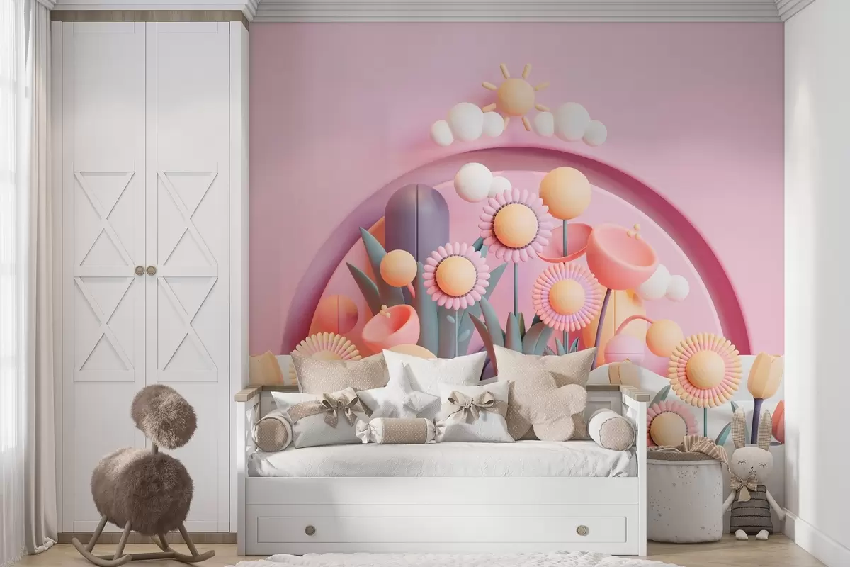 Fototapetes Bērnu tapetes 3D stilā ar ziediem un mākoņiem rozā toņos Nr. w02136