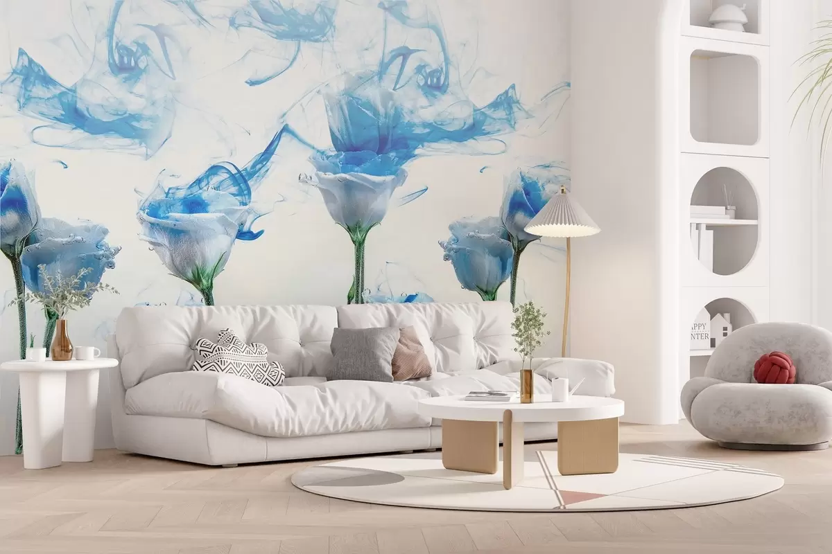 Fototapetes Baltas rozes zem ūdens uz balta fona ar zilām akrila krāsas svītrām. Nr. w02139