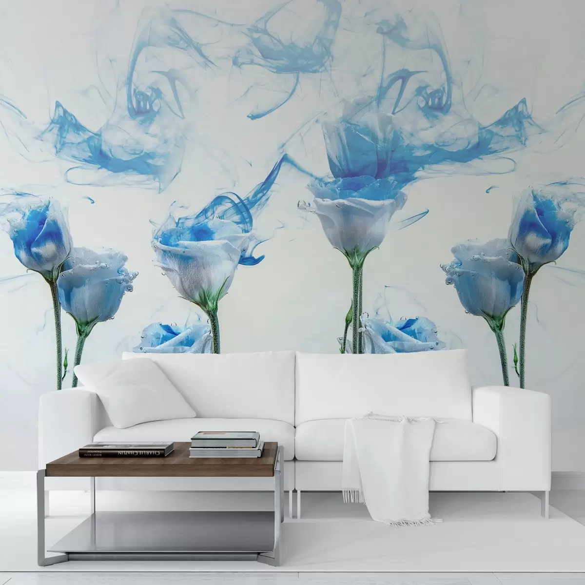 Fototapetes Baltas rozes zem ūdens uz balta fona ar zilām akrila krāsas svītrām. Nr. w02139