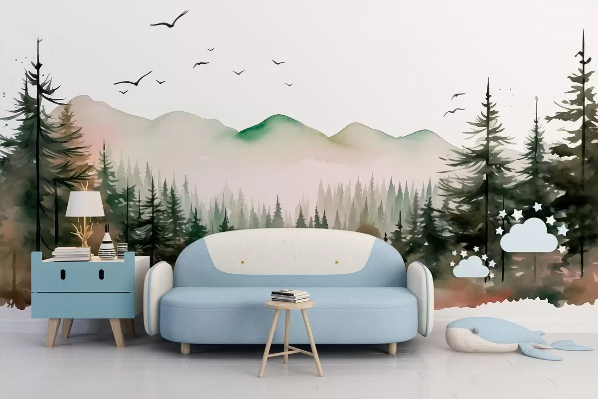 Fototapetes Akvareļu meža un kalnu ainavas, zaļas un rozā krāsas Nr. w02150v1