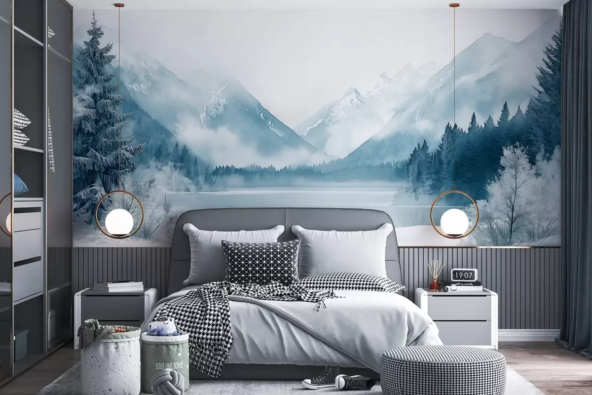 Fototapetes Ziemas kalni, saldēts ezers, priežu mežs, zila krāsu palete, akvareļu stils Nr. w02354
