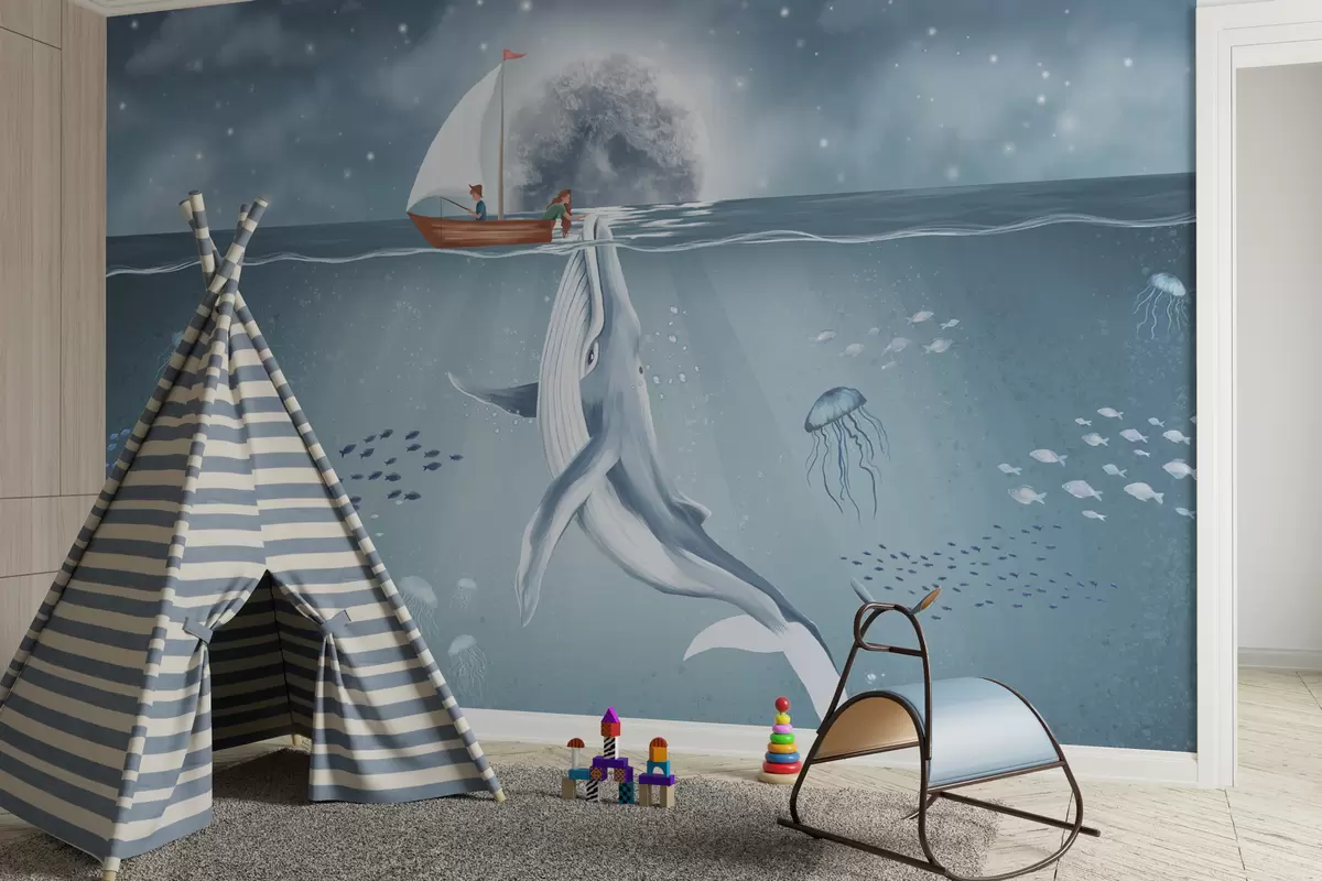Fototapetes Bērnu dizains ar vaļu, mēnesi un laivu kopā ar bērniem Nr. w02476