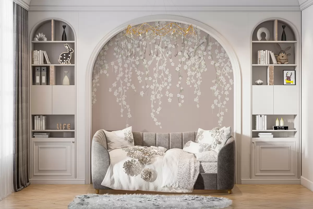 Fototapetes Plūstoši maigi zari ar ziediem uz pasteļkrāsas fona Nr. w02479v2