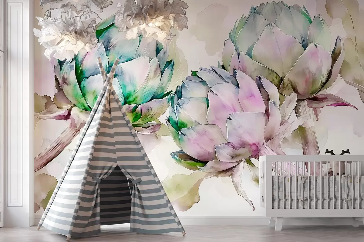 Fototapetes Artišoki akvareļu stilā, ziedi, violeti un zaļi Nr. w02481