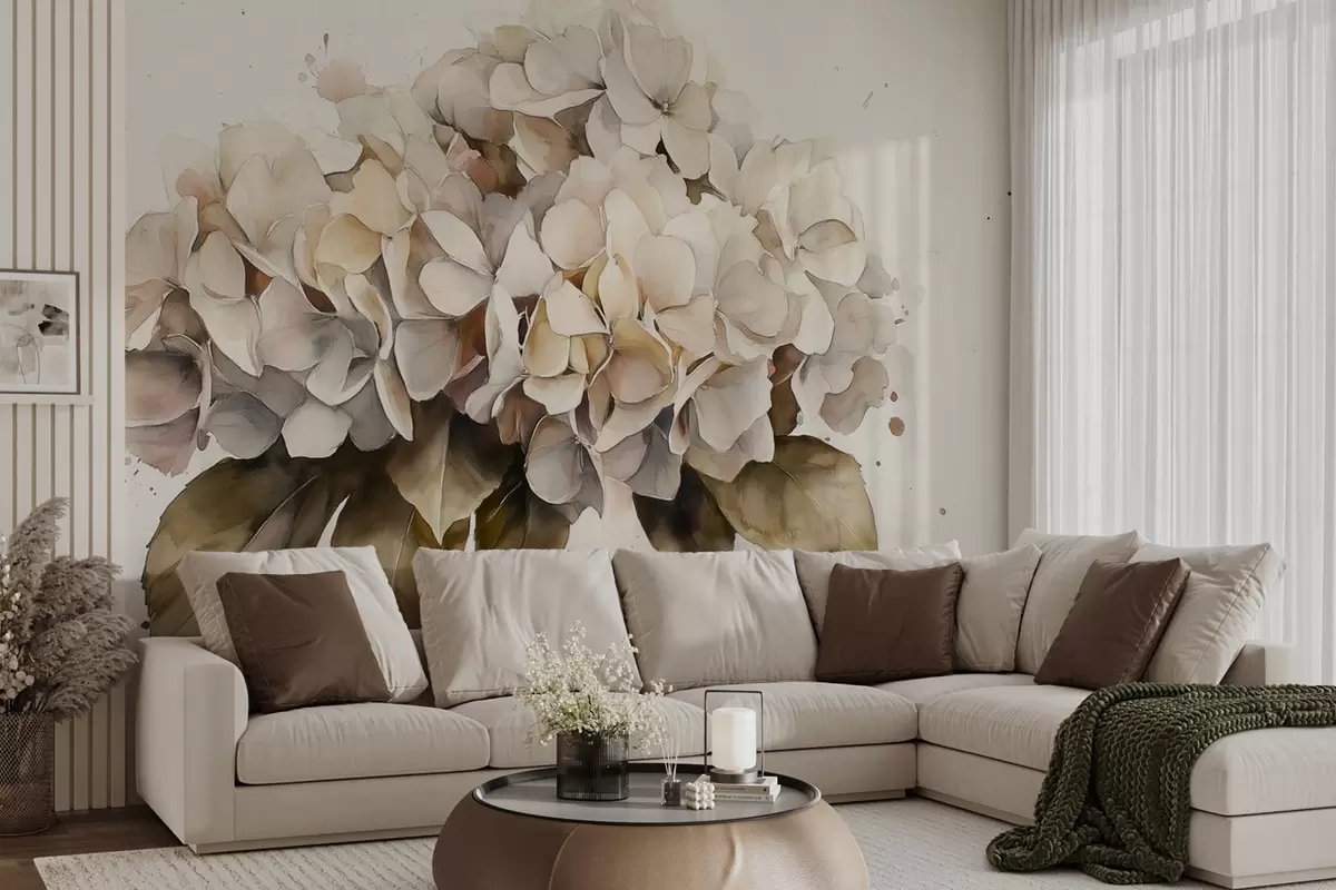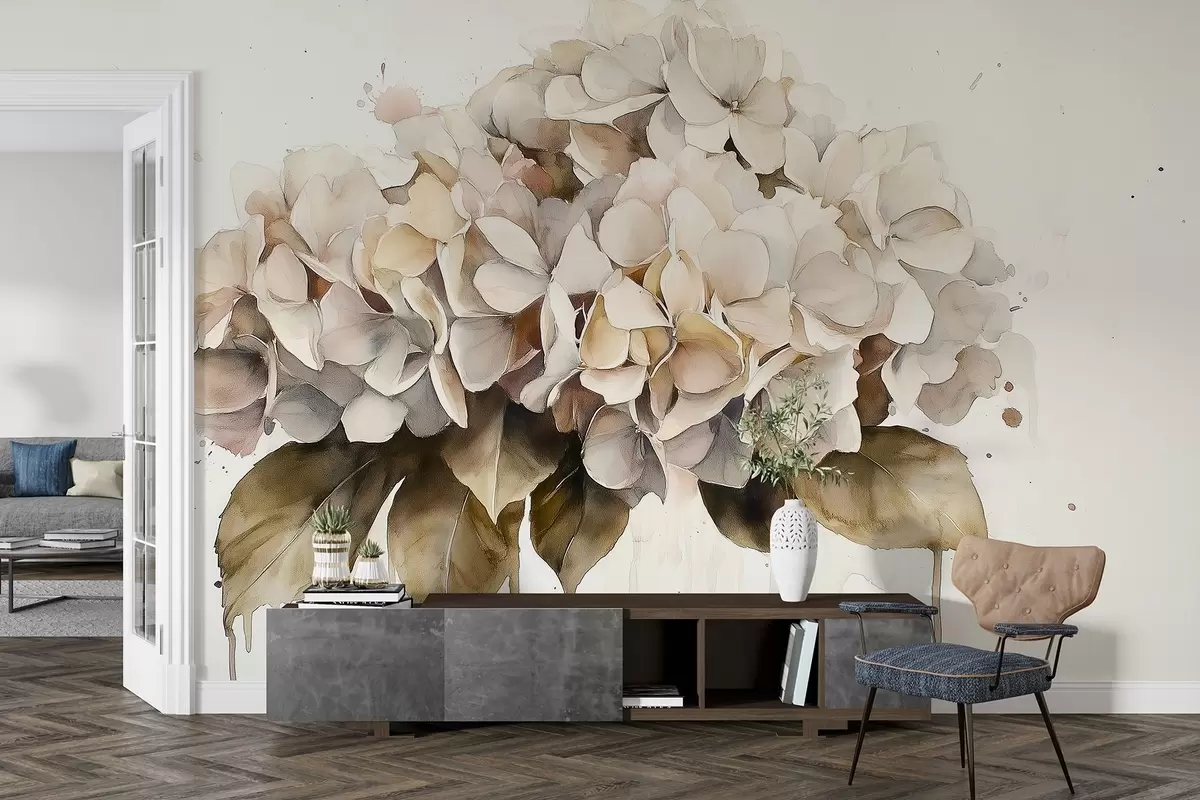 Fototapetes Hortenzijas zieda akvareļa stila zīmējums, smilškrāsas krāsas Nr. w02485