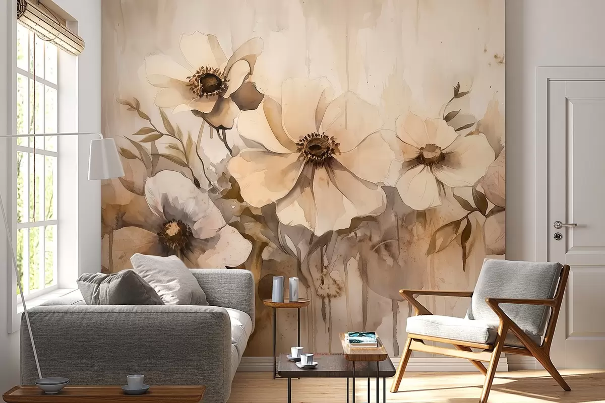 Fototapetes Lauku ziedi, akvareļu stila zīmējums, smilškrāsas krāsas Nr. w02487