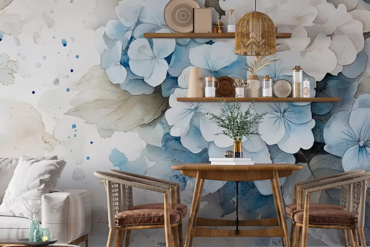 Fototapetes Hortenzijas ziedu ar lapām akvareļa stila zīmējums, maigas dabiskas krāsas Nr. w02493