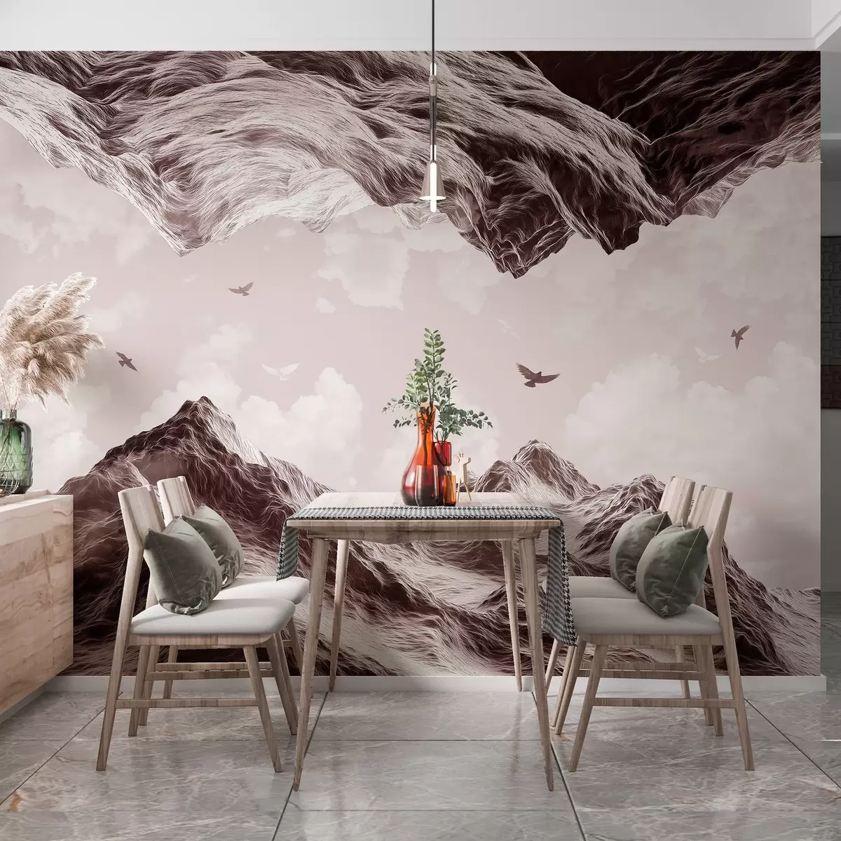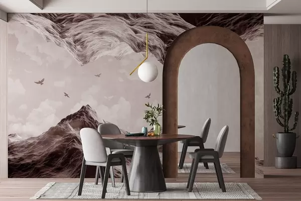 Fototapetes Kalni ainava, reālisms, lidojoši putni, daba, mākoņi, brūnas krāsas Nr. w02514v2