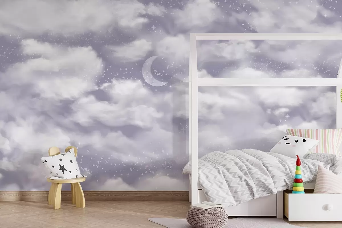 Fototapetes Zvaigžņotas debesis ar mēnesi un mākoņiem, sapņainas, ēteriskas, maigi violetas krāsas Nr. w02515v4