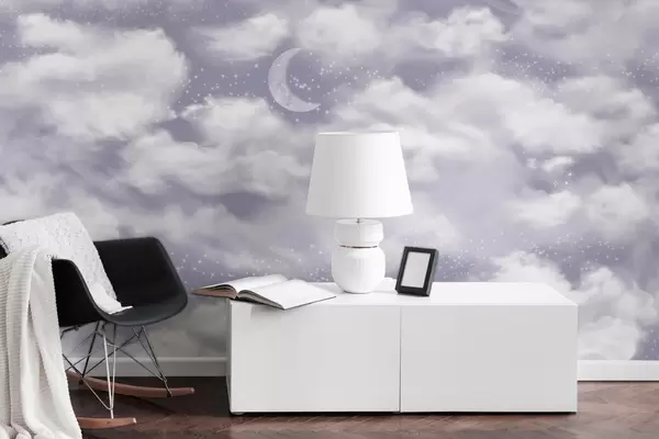 Fototapetes Zvaigžņotas debesis ar mēnesi un mākoņiem, sapņainas, ēteriskas, maigi violetas krāsas Nr. w02515v4