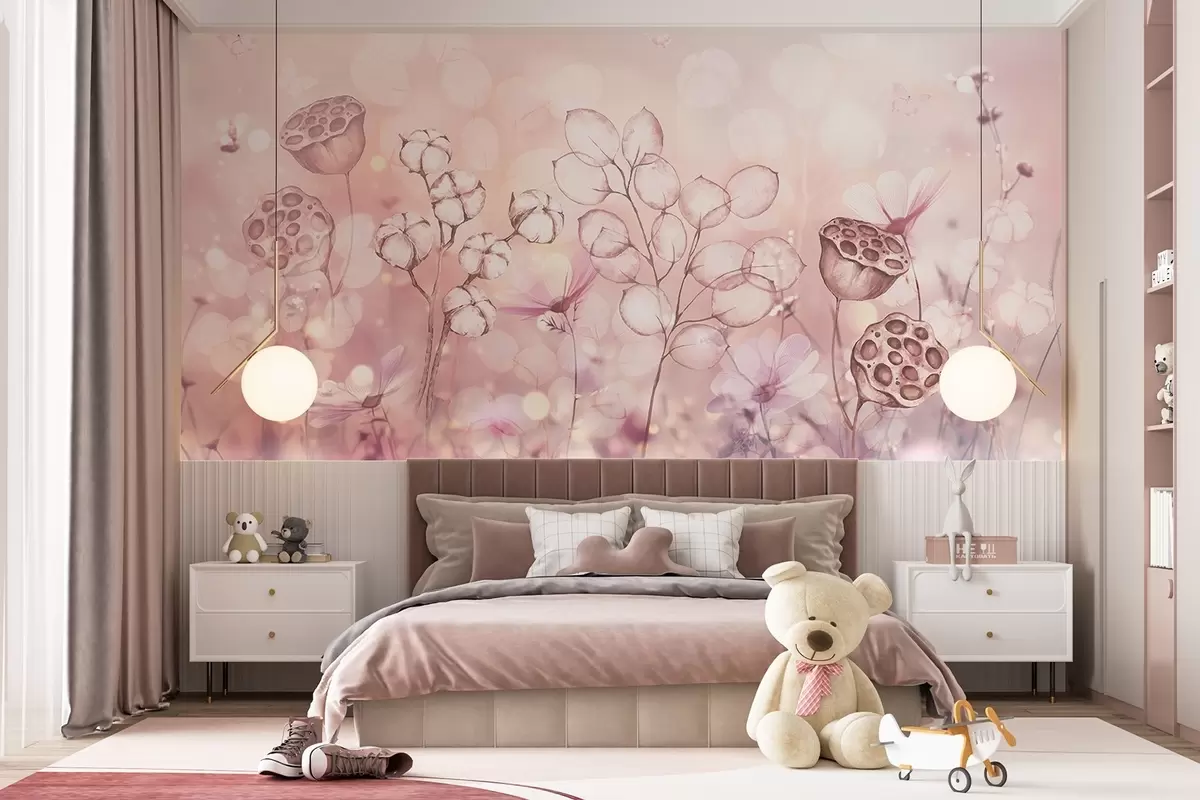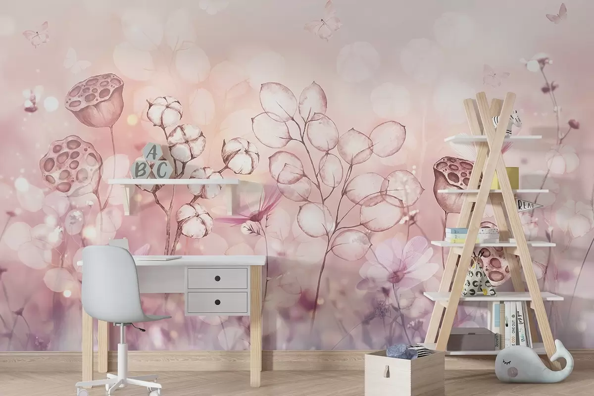 Fototapetes Sapņains ziedu dārzs, tauriņš, kokvilnas ziedi, lotosi, rozā krāsas Nr. w02516