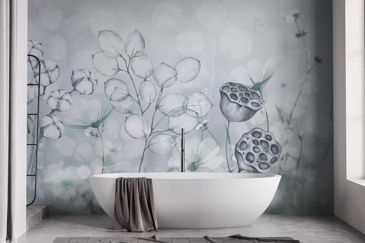 Fototapetes Sapņains puķu dārzs, tauriņš, kokvilnas ziedi, lotosi, pelēkas krāsas Nr. w02516v2
