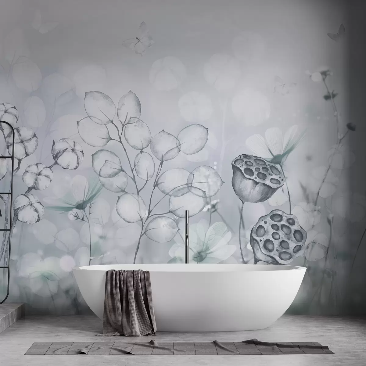Fototapetes Sapņains puķu dārzs, tauriņš, kokvilnas ziedi, lotosi, pelēkas krāsas Nr. w02516v2
