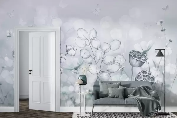 Fototapetes Sapņains puķu dārzs, tauriņš, kokvilnas ziedi, lotosi, pelēkas krāsas Nr. w02516v2