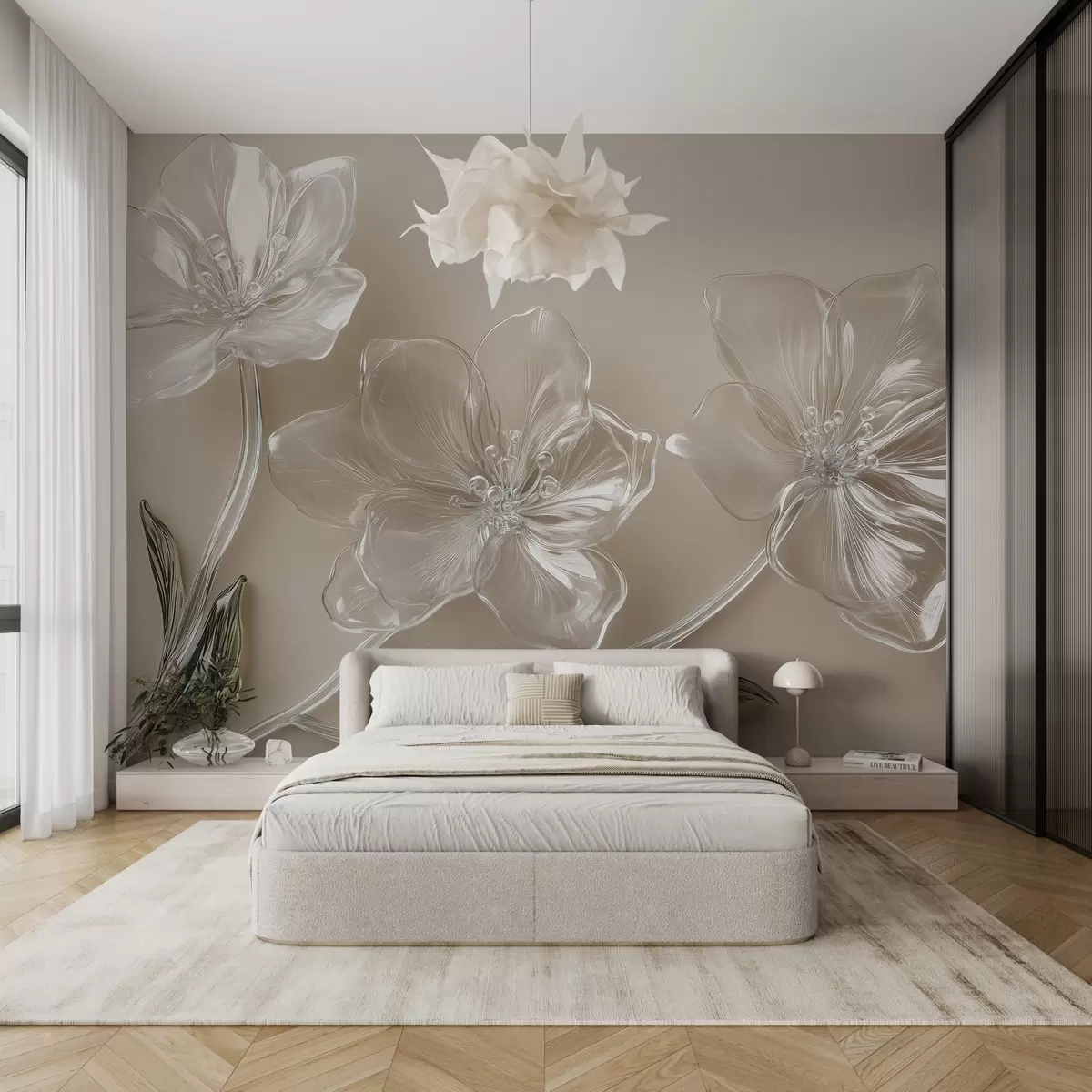 Fototapetes lieli ziedi stikla imitācija uz bēša fona Nr. w02518