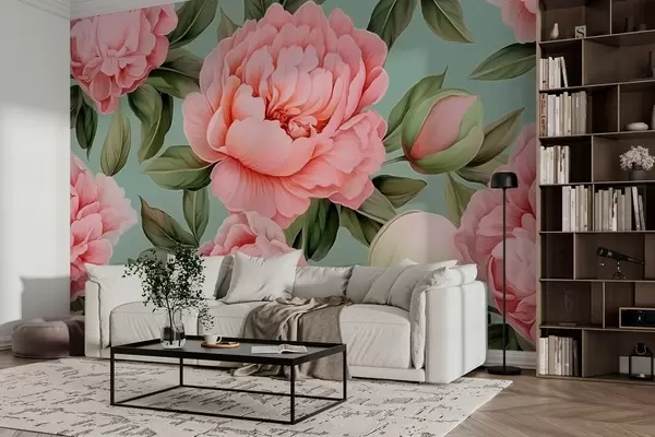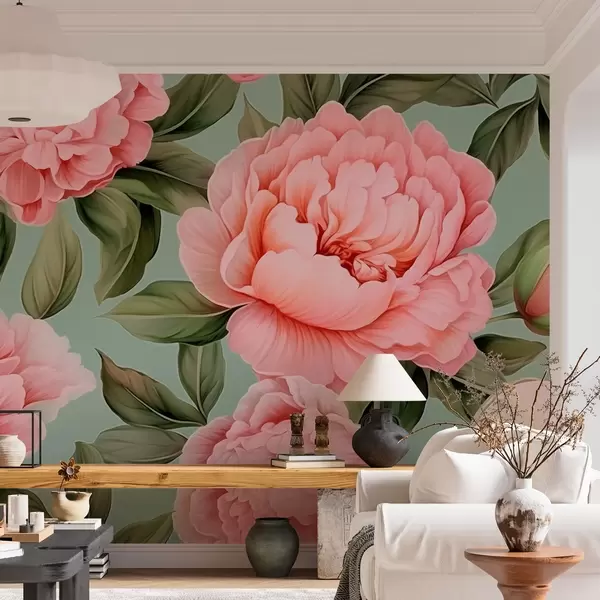 Fototapetes Rozā peonijas ar lapām Nr. w02570