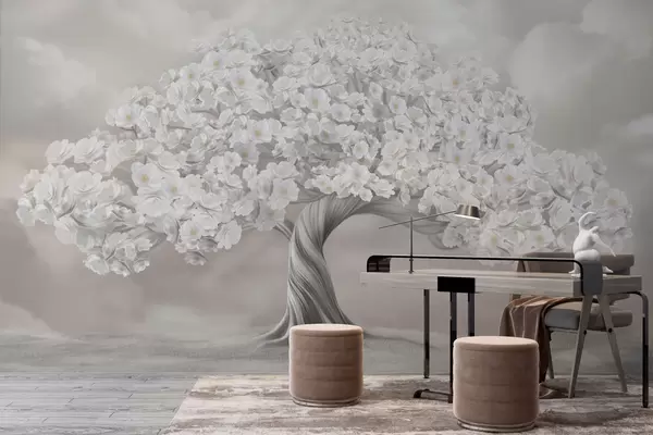 Fototapetes Liels koks ziedos ar mākoņiem fonā pasteļtoņos Nr. w02748v1