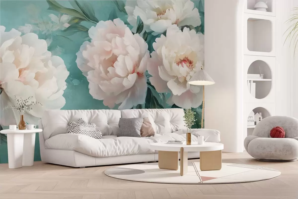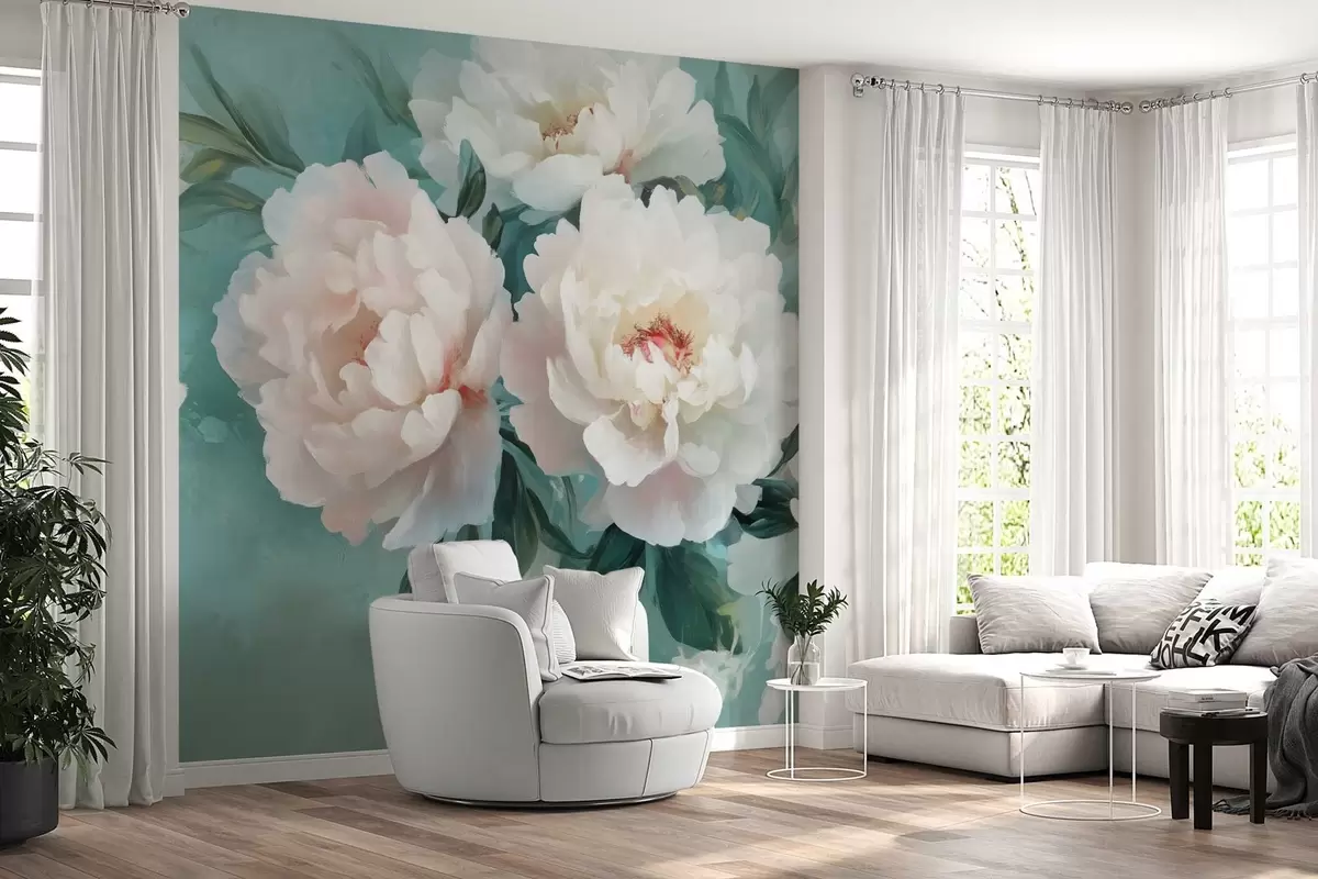Fototapetes lieli sulīgu peoniju ziedi uz tirkīza fona Nr. w02763