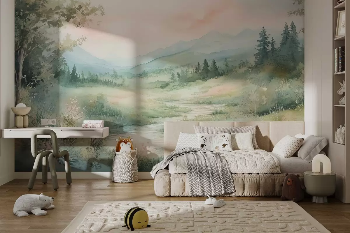 Fototapetes akvareļu ainava ar ceļu un kalniem Nr. w02764