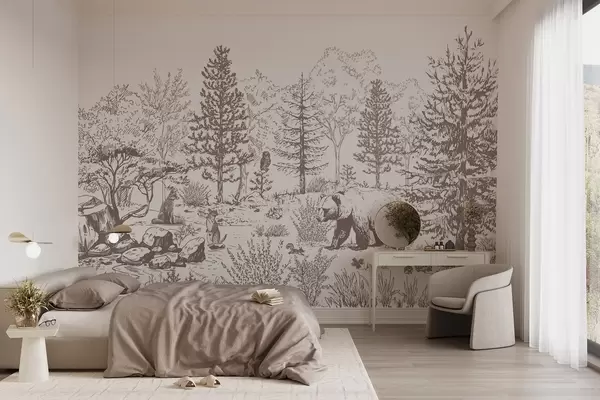 Fototapetes Meža dzīve, koki, savvaļas dzīvnieki, lācis, lapsa, pūce, krūmi, zīmējums zīmuļa stilā, bēšas krāsas Nr. w02929