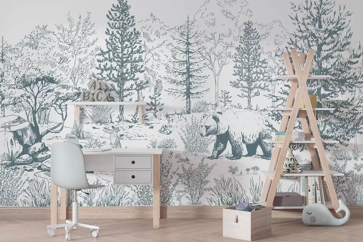 Fototapetes Meža dzīve, koki, savvaļas dzīvnieki, lācis, lapsa, pūce, krūmi, zīmuļa stila zīmējums, zilas krāsas Nr. w02929v1