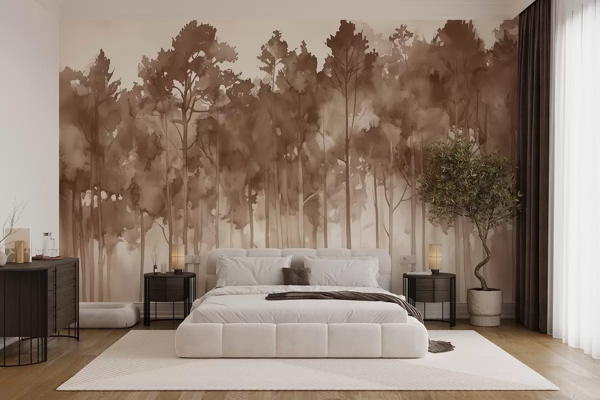 Fototapetes Akvareļu stila mežs, priedes, dabas ainava, smilškrāsas krāsas Nr. w02937v1