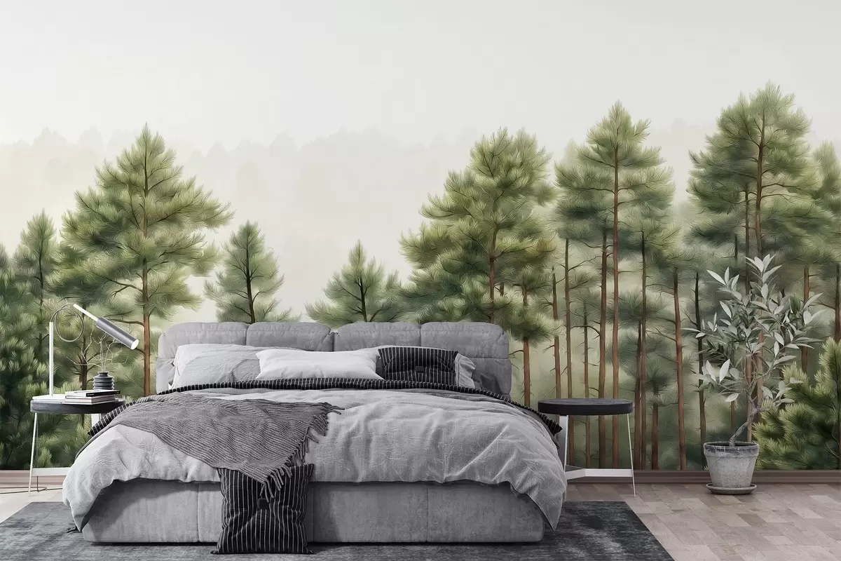Fototapetes Mežs ar priedēm, eļļas stila zīmējums, daba Nr. w02942