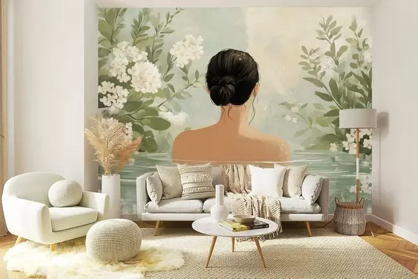 Fototapetes mierīga un sapņaina botāniska ilustrācija, kurā attēlota sieviete, kas peldas mierīgā, atstarojošā ūdenstilpē, ko ieskauj sulīga zaļuma un maigi balti ziedi. Nr. w03014