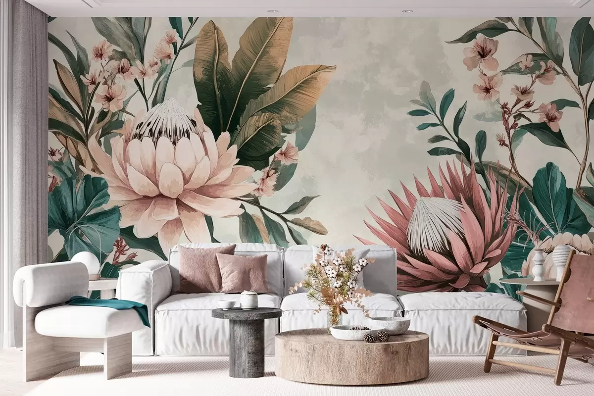 Fototapetes eksotiskie augi, palmu lapas un proteju ziedi, ko iedvesmojis vintage stils Nr. w03015