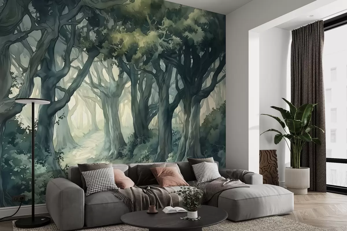 Fototapetes Mežs ar lieliem kokiem, zaļa krāsa spallete, akvareļu stila zīmējums Nr. w03150