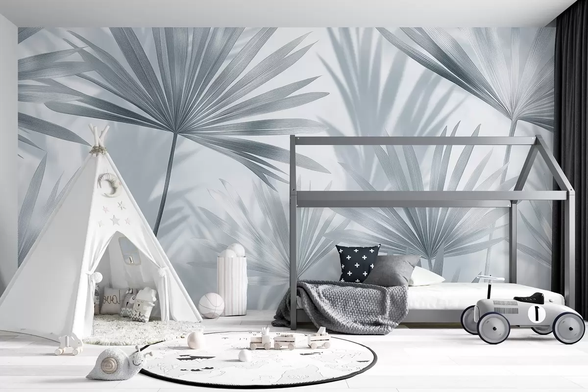 Fototapetes Palmu lapas, ziedu raksts, minimālisms, tropu, pelēkas krāsas Nr. w03152v1