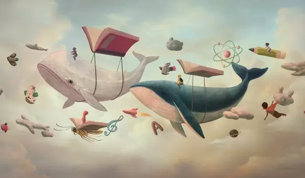 Fototapetes Ilustrācija ar vaļiem, kas lido debesīs zem grāmatas formas baloniem Nr. w03327