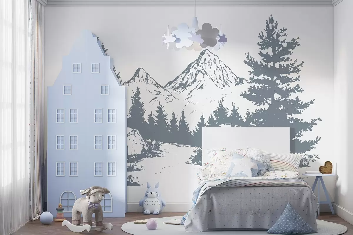 Fototapetes Alpi, kalni ar mežu, līnijzīmējums, pelēka krāsa Nr. w03342v2