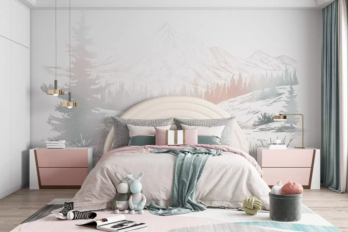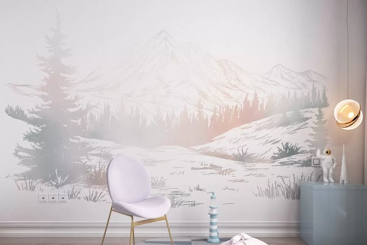 Fototapetes Kalnu ainava ar priedēm, mežs, daba, krāsains Nr. w03344v4