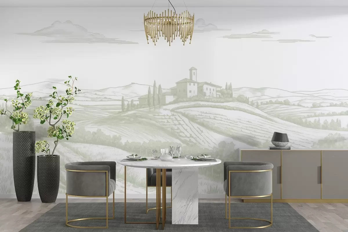 Fototapetes Toskānas ainavas, Itālija, vīna dārzi, daba, veca pils, zaļas krāsas Nr. w03349v2