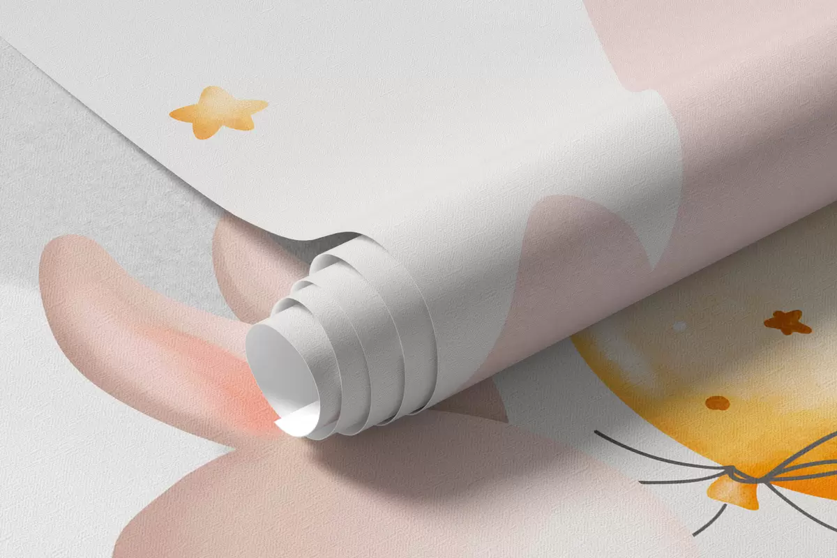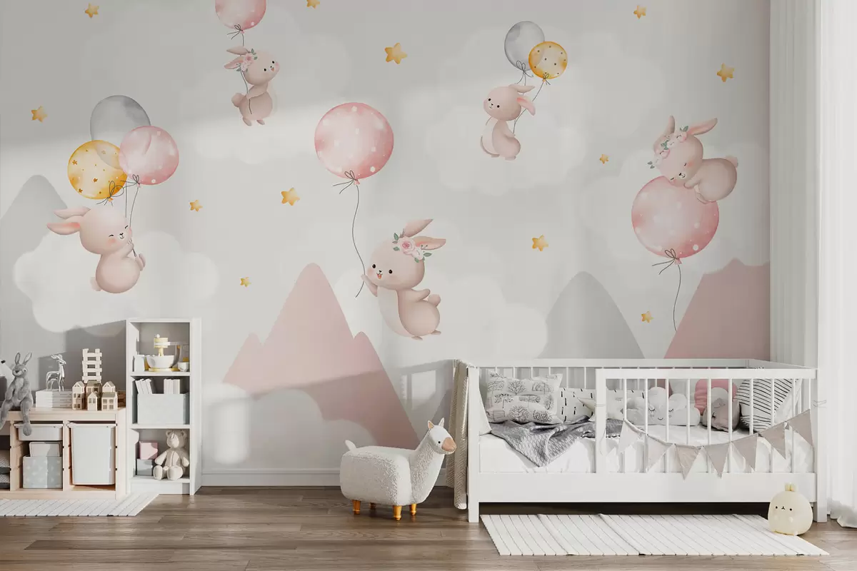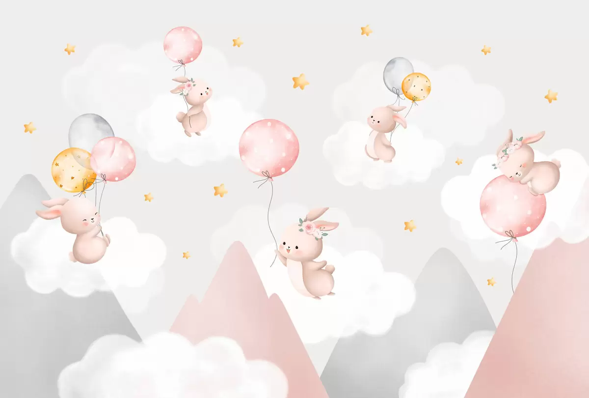 Fototapetes Zaķi ar baloniem uz mākoņiem starp kalnu virsotnēm Nr. w03375