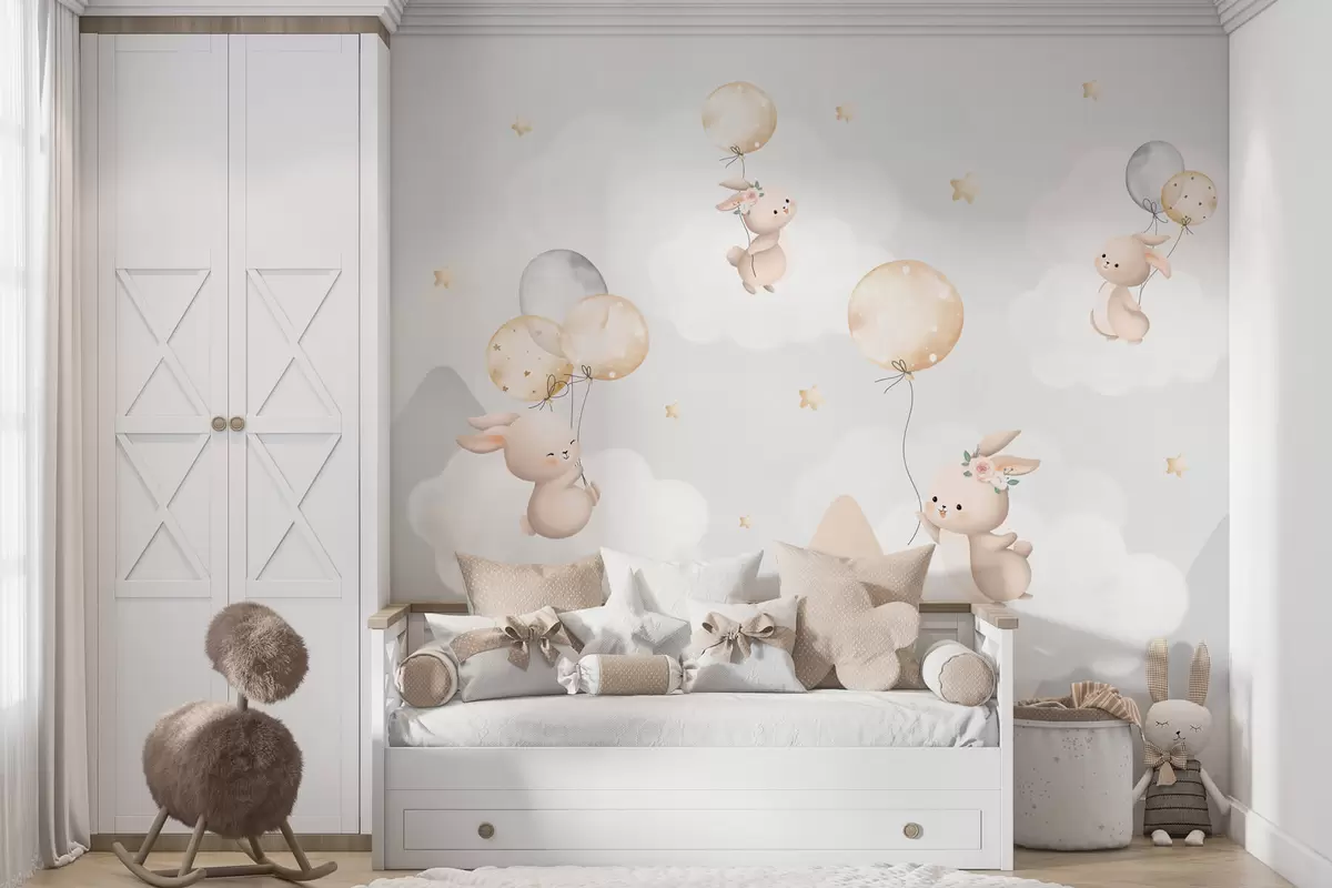 Fototapetes Zaķi ar baloniem uz mākoņiem starp kalnu virsotnēm Nr. w03375v1