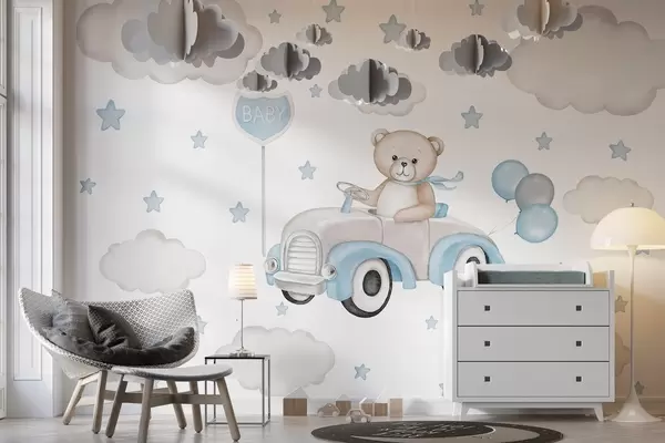 Fototapetes Burvīga ilustrācija ar lācēnu, kas brauc ar senlaicīgu automašīnu starp mākoņiem un zvaigznēm Nr. w03382v1